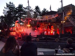 La presenza di una scenografia molto ricca e disposta su più livelli permette anche di avere scene movimentate che non annoiano lo spettatore. Qualche appunto si potrebbe fare sull’audio che, la sera in cui abbiamo partecipato alla cena, non era sempre chiaro ed in alcuni momenti causava qualche difficoltà per la comprensione della storia raccontata, ma confidiamo che si sia trattato solo di un imprevisto tecnico. Al termine della serata, è possibile scattare delle foto ricordo con il cast artistico, nella splendida cornice del galeone pirata ed i bambini hanno la possibilità di fare un giro sul percorso avventura disponibile sulla nave.